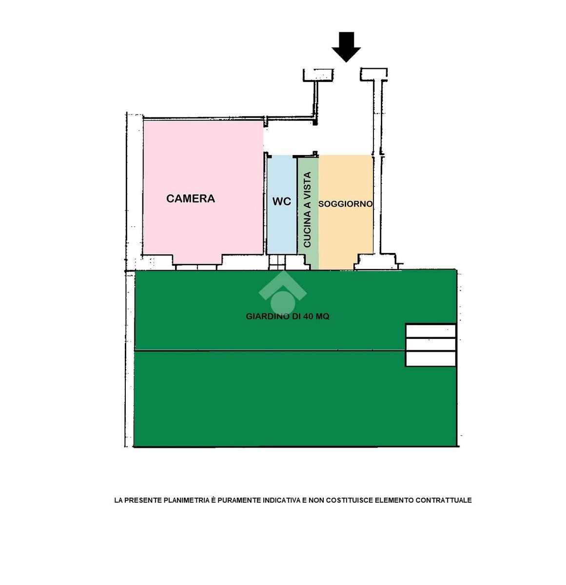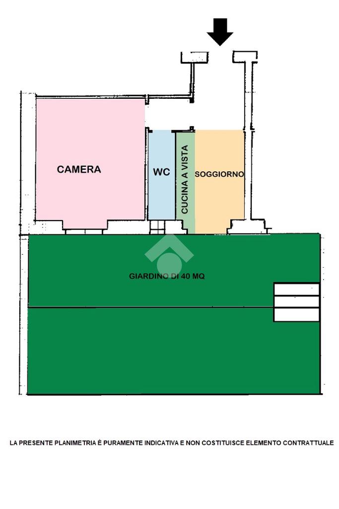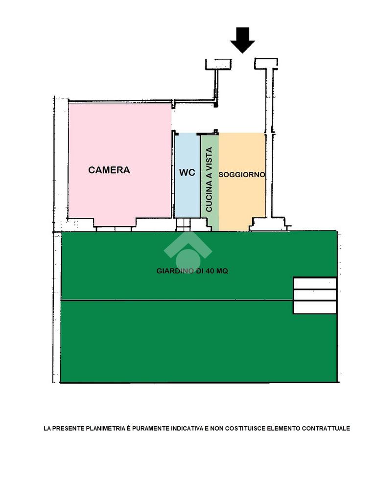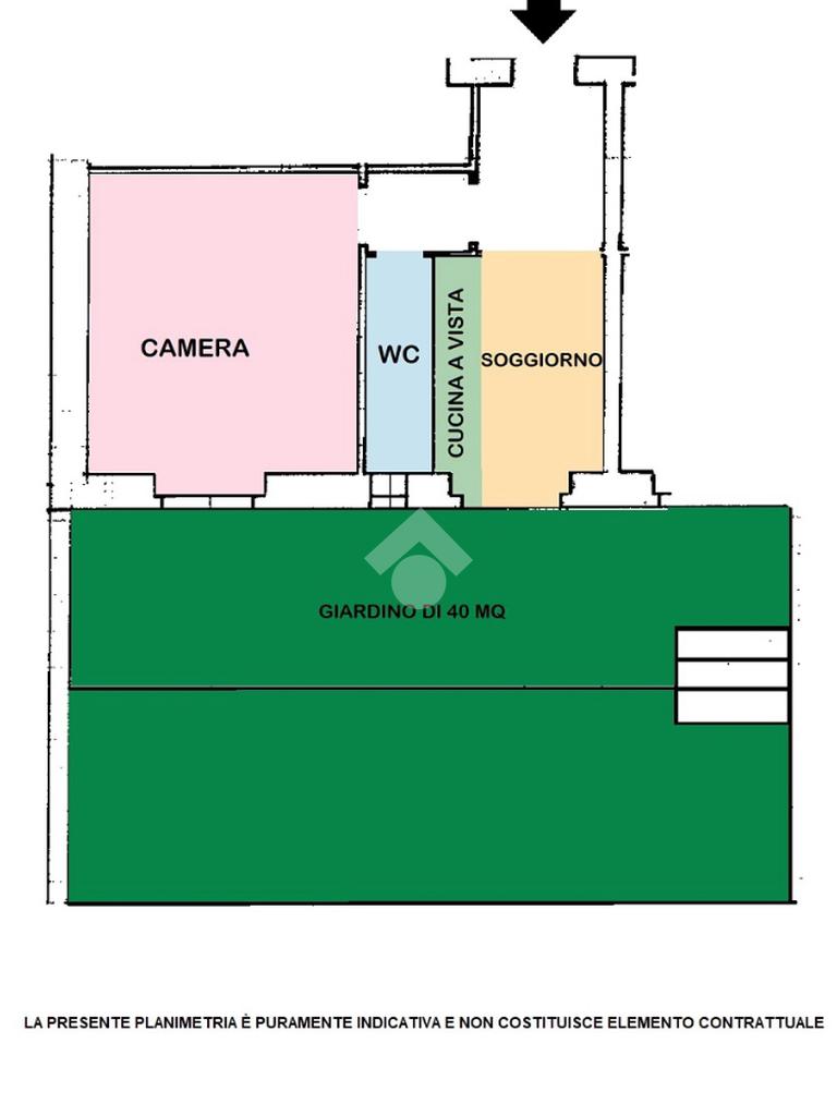 Internamente è composto da ingresso, soggiorno con cucina a vista, una comoda camera matrimoniale, un bagno completo di box doccia e finestra e un giardino disposto su due livelli, in parte pavimentato e in parte in terra.