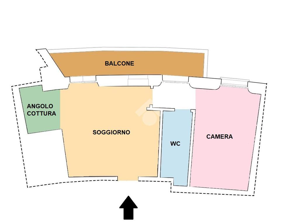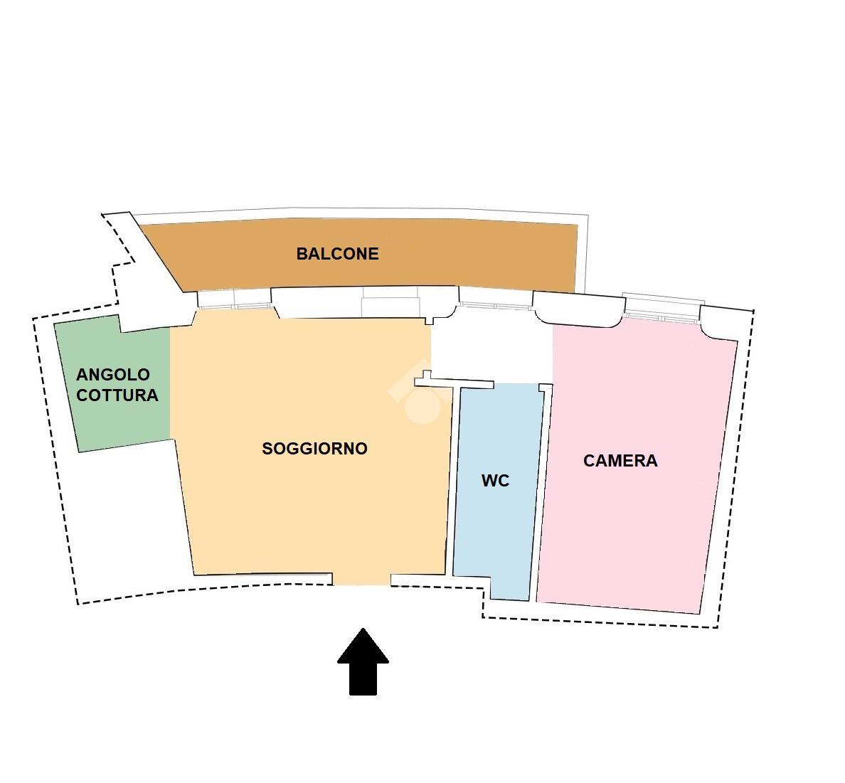All'interno dell'unità immobiliare l'ingresso è open nella zona living con cucinotto, peculiare finestra a forma di oblò e porta finestra di accesso al balcone perimetrale di 8 mq. Vi è un disimpegno che separa la zona giorno dalla zona notte; da questo si accede al bagno, completo e dotato di box doccia e alla camera da letto,al balcone perimetrale.