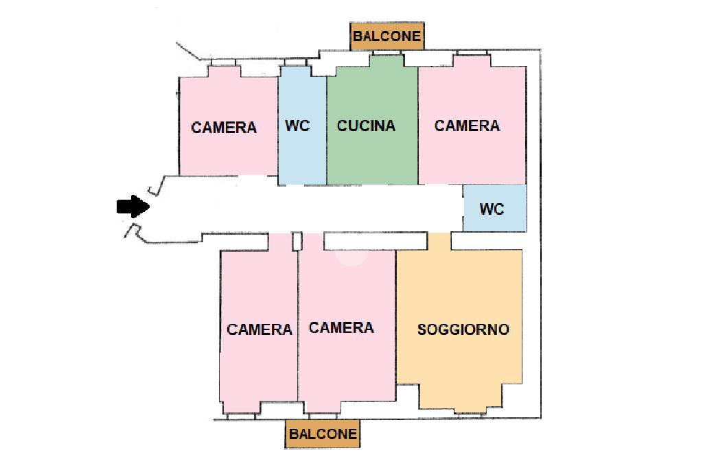 L'immobile è attualmente suddiviso in soggiorno, quattro camere, cucina abitabile, due bagni e due balconi.